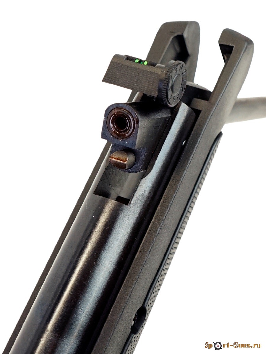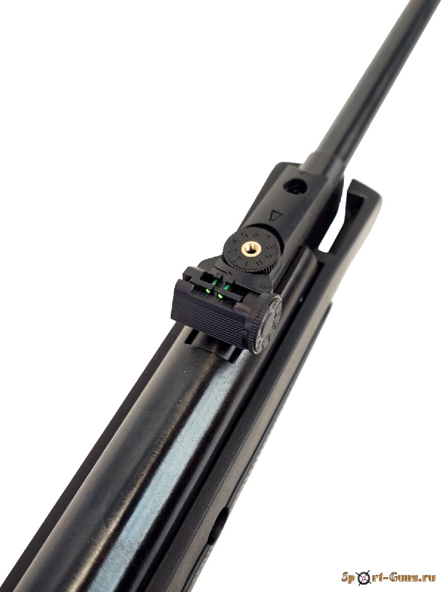 Присутствует предохранитель для защиты стрелка от случайного выстрела. Целик и мушка Truglo дополнительно оснащены фибероптическими нитями для повышения качества стрельбы. Направляющая 11 см предназначен для установки прицелов. Приклад винтовки изготовлен из прочного полимера, ствол стальной. Затыльник приклада из плотной резины хорошо гасит отдачу при выстреле. Вес винтовки 2,8 кг, дина – 110 см. В комплекте манжета-запаска, переносная сумка и документация.